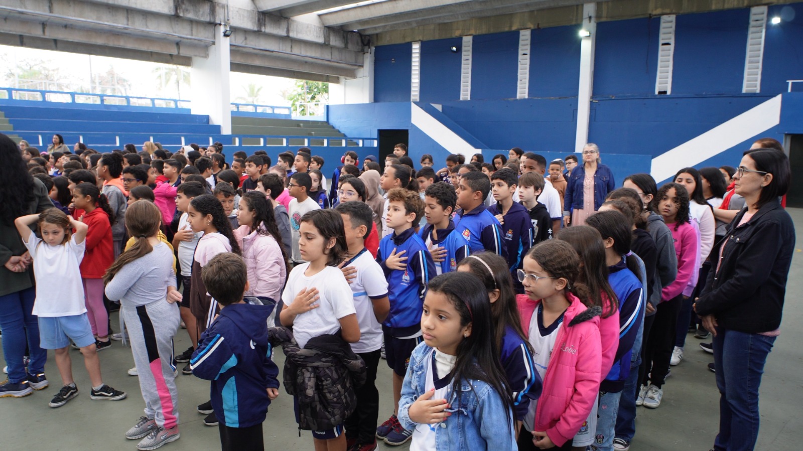 Os alunos da E.M Almeida Junior participaram da solenidade de abertura, na última segunda-feira (4), no Ginásio Tejereba. O momento contou com o juramento de atletas, apresentação de jiu-jitsu e atividades recreativas, como a tradicional queimada. Durante a semana, haverá disputas de basquete e futsal, entre outras modalidades.