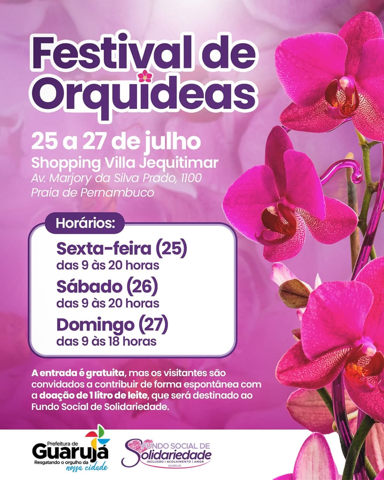 Venha prestigiar as mais belas orquídeas em exposição e aproveite para colaborar com o Fundo Social de Solidariedade, doando 1 litro de leite de forma espontânea. Sua contribuição faz a diferença!